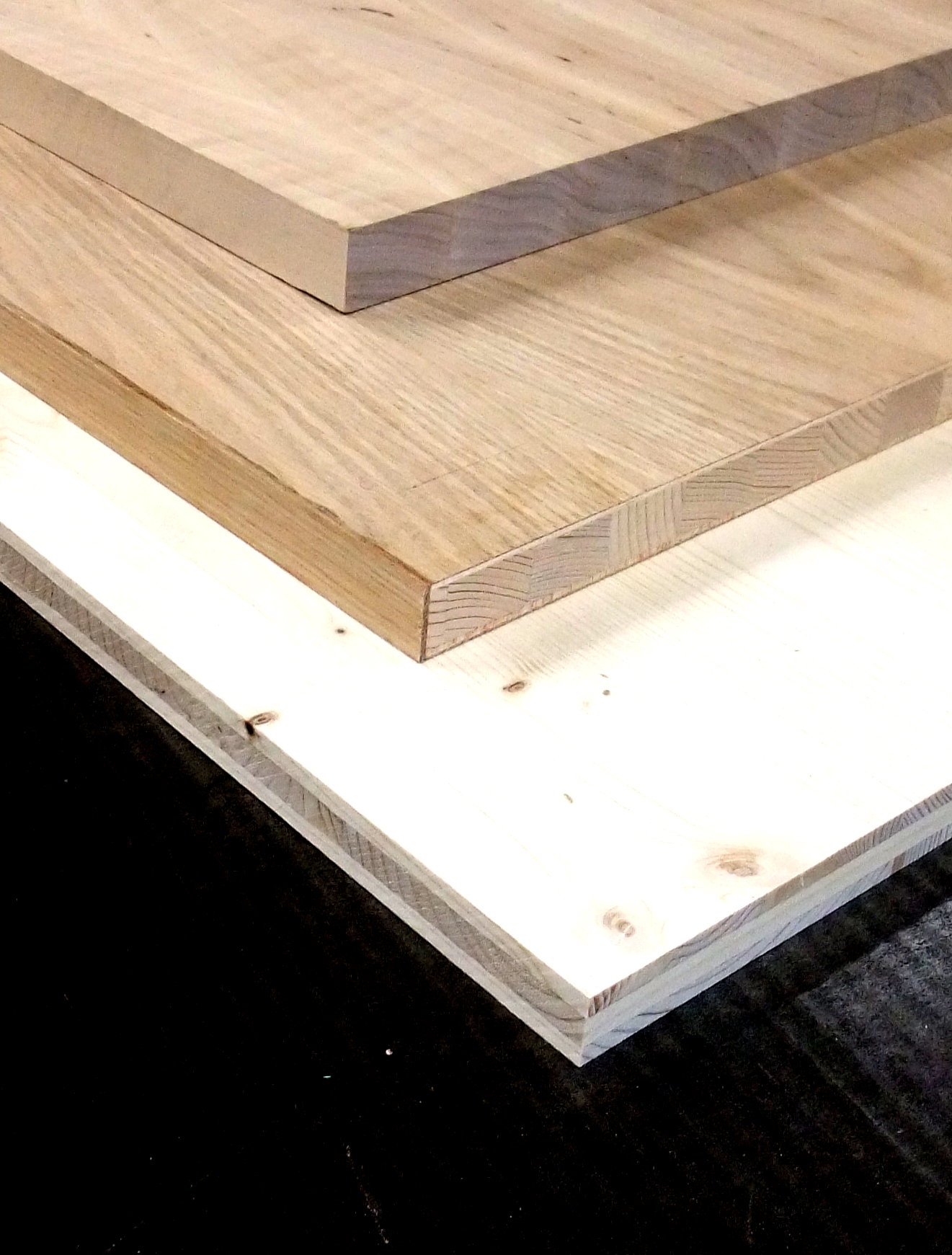 Anders als die Tischlerplatte ist die Dreischichtplatte aufgebaut: Drei gleich dicke Lagen Vollholz sind aufeinandergeleimt, die mittlere Lage quer zu den beiden äußeren. Auch diese Platte ist dünn (19 mm), glatt und formstabil. Sie wird üblicherweise ohne Anleimer verarbeitet, weil auch die Mittellage das selbe Holz wie die Decklagen aufweist.