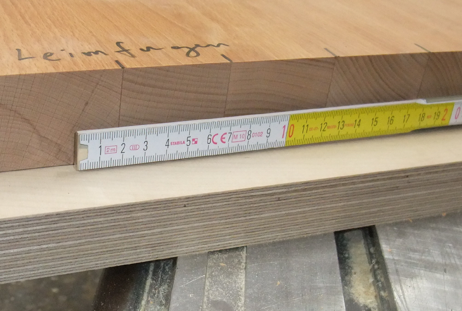 Auf dem Bild rechts sehen Sie oben eine massive Buchenplatte, aus eigener Herstellung. Auf 20 cm Plattenbreite nehmen wir 4 senkrechte Leimfugen in Kauf, bei einer Dicke von 3 cm also 4 x 3 = 12 cm Leimfugenlänge.